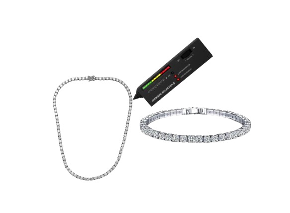 Ce bundle réunit une chaîne et un bracelet Tennis 4 mm en moissanite certifiée, montés sur argent 925. Le testeur de diamant inclus permet à tes clients de vérifier la qualité par eux-mêmes, en direct — un vrai levier de confiance qui augmente la valeur perçue. Parfait pour le drop ou la vente en boutique avec une marge optimisée.