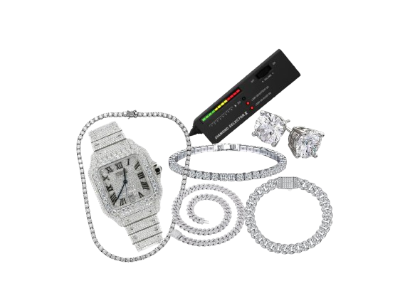 Ce pack exclusif rassemble 6 pièces en moissanite certifiée, pour un rendu visuel massif et cohérent. Montre bustdown, chaînes, bracelets et boucles d’oreilles : tout y est pour incarner un lifestyle complet, avec un testeur de diamant inclus pour valider la qualité en direct. Que ce soit pour impressionner un client haut de gamme ou pour maximiser les ventes à l’unité, ce bundle est une véritable machine à marges.
